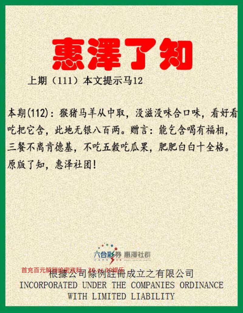 【惠泽了知】112期:猴猪马羊从中取,没滋没味合口味,解明肖猴猪马羊。看好看吃把它含,此地无银八百两。解地肖鼠虎蛇羊鸡狗。赠言:能乞含喝有福相,三餐不离肯德基,不吃五穀吃瓜果,肥肥白白十全格。