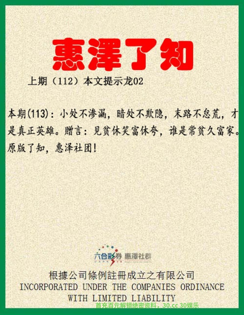 【惠泽了知】113期:小处不渗漏,暗处不欺隐,末路不怠荒,才是真正英雄。贈言:见贫休笑富休夸,谁是常贫久富家。诗文意思为:细微之处不可粗心大意疏忽遗漏,在没人见的地方不能做见不得人的事,即使处于穷途末路的时候也振作精神、奋发向上,这才是真正的英雄好汉。小处解小肖:鼠兔龙蛇猴鸡。暗处解阴肖:鼠龙马蛇狗猪。