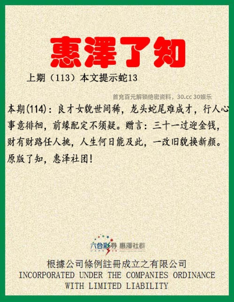 【惠泽了知】114期:良才女貌世间稀,龙头蛇尾难成才,解明肖龙蛇。才子肖虎龙猪马。行人心事意徘徊,前缘配定不须疑。前缘解前肖鼠牛虎兔龙蛇。赠言:三十一过迎金钱,财有财路任人挑,人生何日能及此,一改旧貌换新颜。